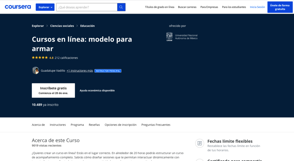 Como parte de su oferta de actualización docente, la CUAIEED continúa impartiendo el MOOC “Cursos en línea: Modelo para armar” a través de la plataforma Coursera. Al ser docente de la UNAM, puedes participar de manera gratuita y obtener tu certificado al concluir todas las actividades (inicia sesión en Coursera usando tu cuenta de correo institucional @ fad.unam.mx ). Esta actividad también está considerada como una opción para la exención de firmas en este período interanual. Si deseas inscribirte, haz clic en el siguiente botón: